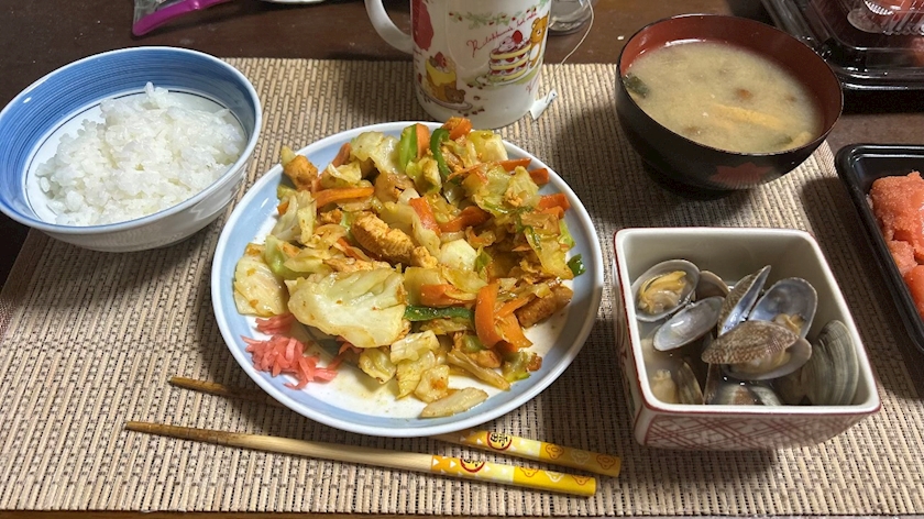 とりあえずご飯炊いてフライパンで野菜炒め作って味噌汁は出汁入れてなめこ入れてあさりの酒蒸しは湯煎した冷凍品だった🍚