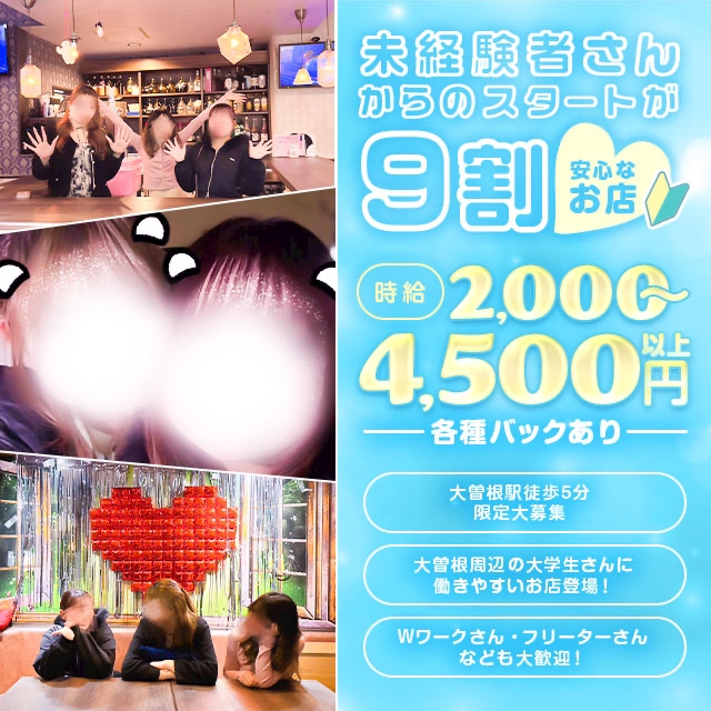 お店の特徴として、18歳~30代前半の夜のお仕事未経験者が90%のお店で、入店する子はほとんどが未経験から始める子ばかりです。だから夜のお仕事が怖くてなかなか踏み込めない子でも、未経験から始めた先輩スタッフがしっかりフォローしてくれるし、悩み事や相談も気軽に聞いてくれるから、安心して夜の世界に挑戦できます!また、お友達と一緒に面接や体験入店も可能だから、働きに行くというよりはどんなお店か知る為に遊びに行く感覚で大丈夫です!