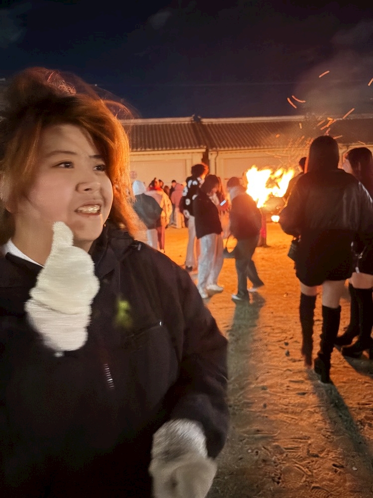 焚き火の火の粉が舞ってて
