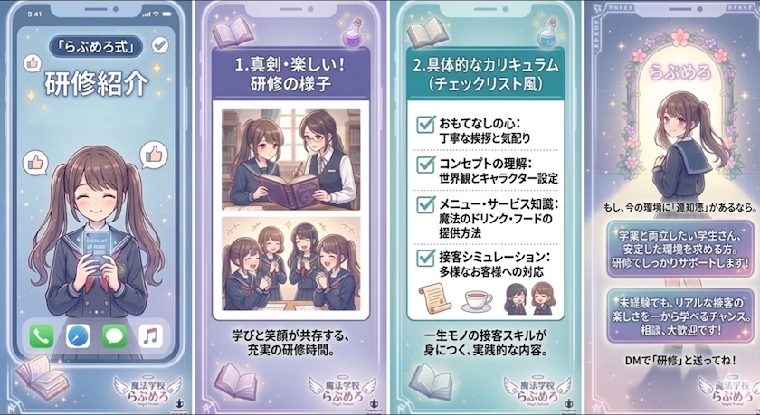らぶめろは、法人運営だからこそ、感覚ではなく「技術」として接客を教えるカリキュラムがあります。