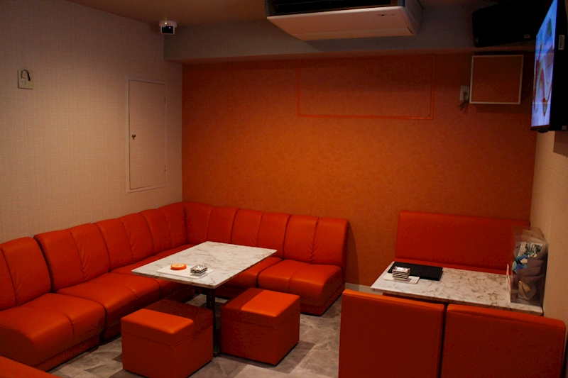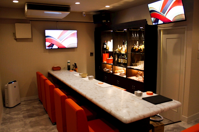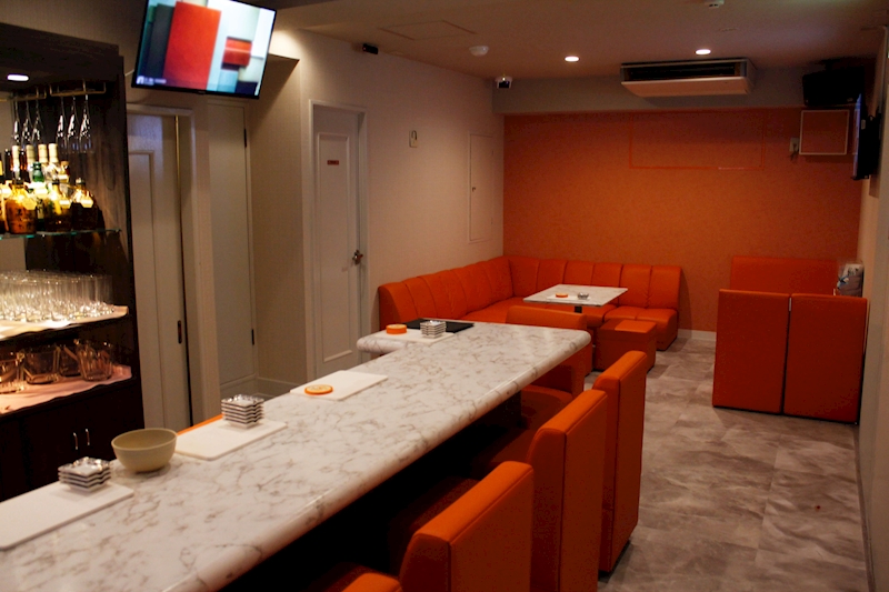 夕焼けをイメージした店内は、白とオレンジを基調とした全面改装された清潔な内装で、カウンター6席とボックス2卓あります。