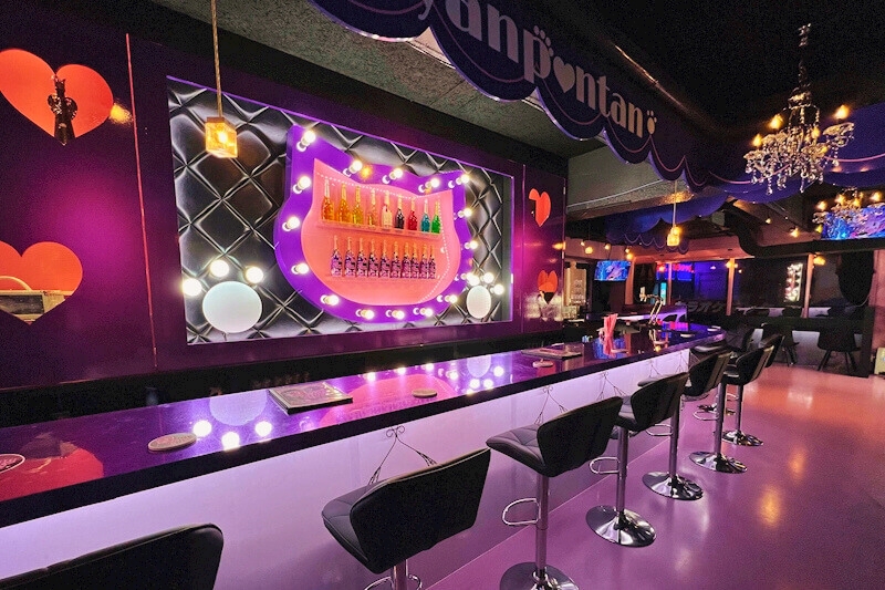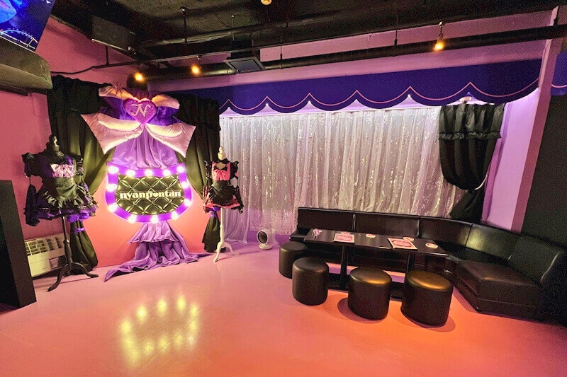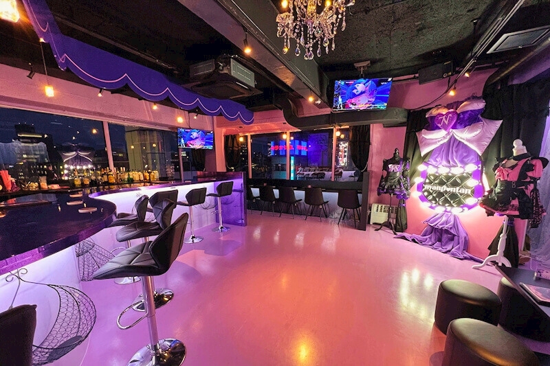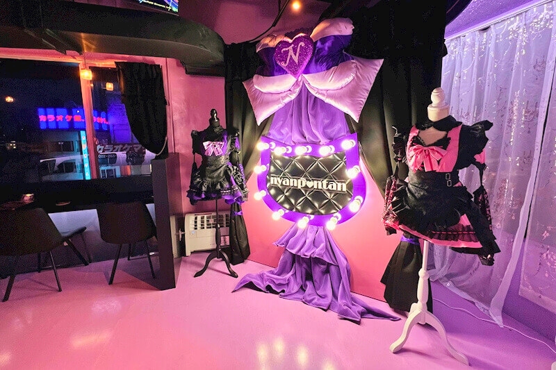 パープル×ピンクのかわいい店内に同じ色のオリジナル衣装。