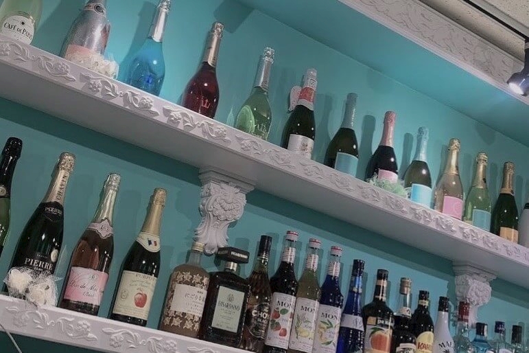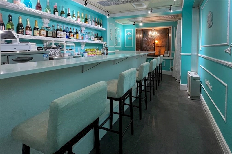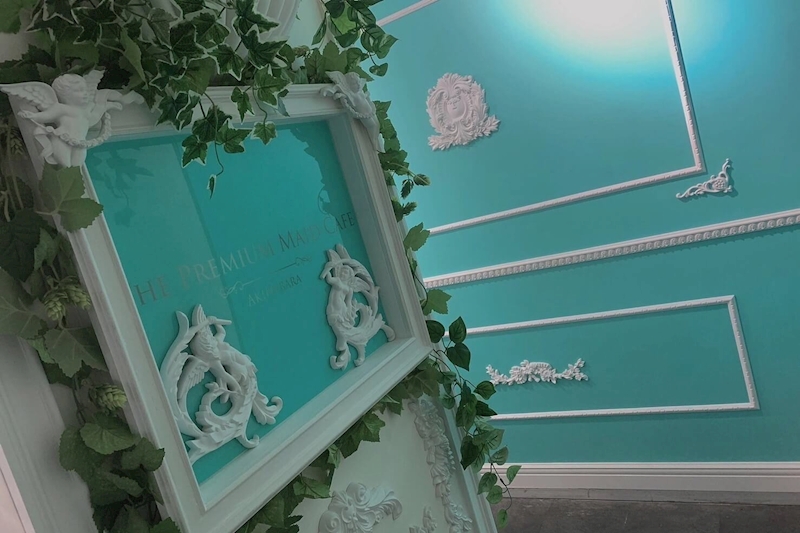 ティファニーブルーを基調とした店内でキュートなオリジナル衣装を着てお給仕できるのが、The Premium Maid Cafe(プレミアムメイドカフェ)。フリルたっぷりのコスチュームはホワイトとブラックの2種ご用意していて、気分にあわせて選べるようになっています。